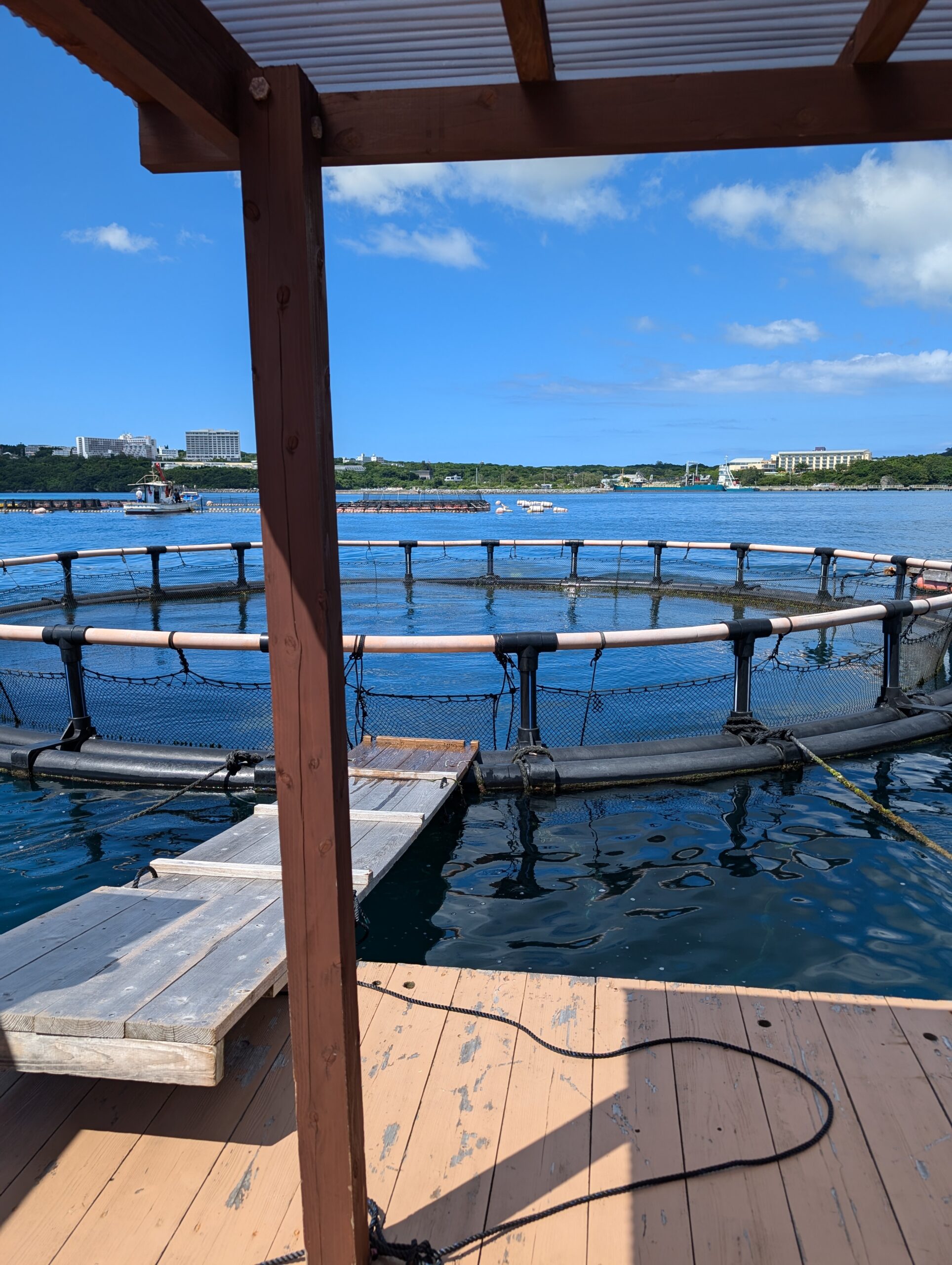 洋上いけす(二基)、簡易水洗トイレ、洋上の東屋(あずまや)があります。