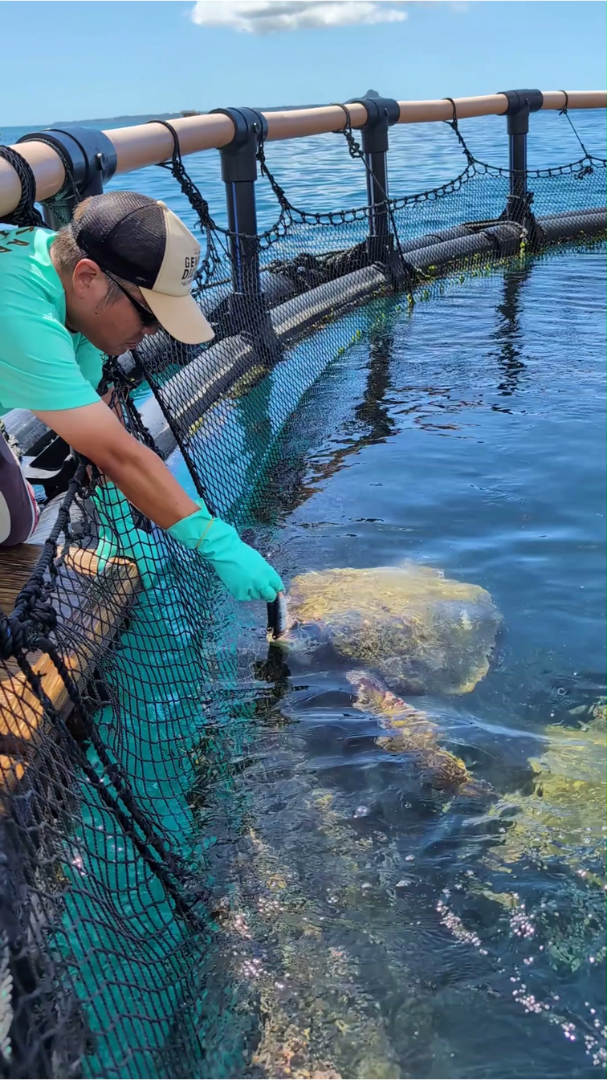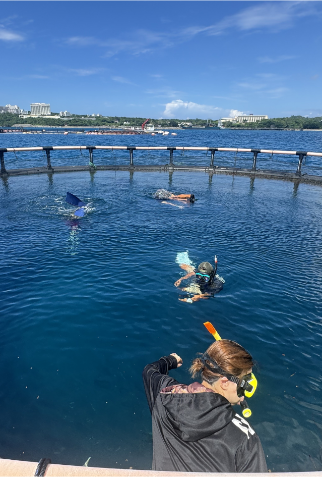 洋上の「いけす」の中で体験シュノーケリング 港から船で10分、洋上のプールの中で、ウミガメやエイと、一緒に初心者でも、体験シュノーケリングができる!
