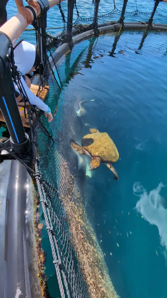 亀やウシバナトビエイ、 沖縄の海洋生物と一緒に安全に泳げる、 レストラン『さかなかなさ』のバックヤード